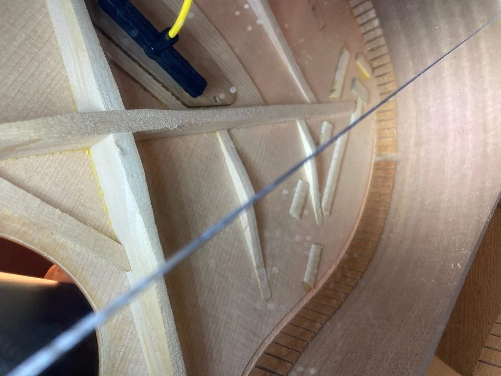 Guild cracked bridge removal and spruce top repair